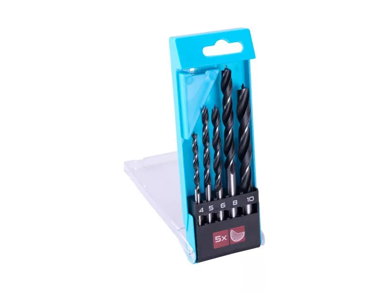 A leggyakrabban használt fúrószárak készlete 4, 5, 6, 8, 10 mm-es fához, felhasználás: általános műhelyi és barkácsolási használatra, fába fúrás, forgácslap, OSB panelek..., csomagolás - fólia.