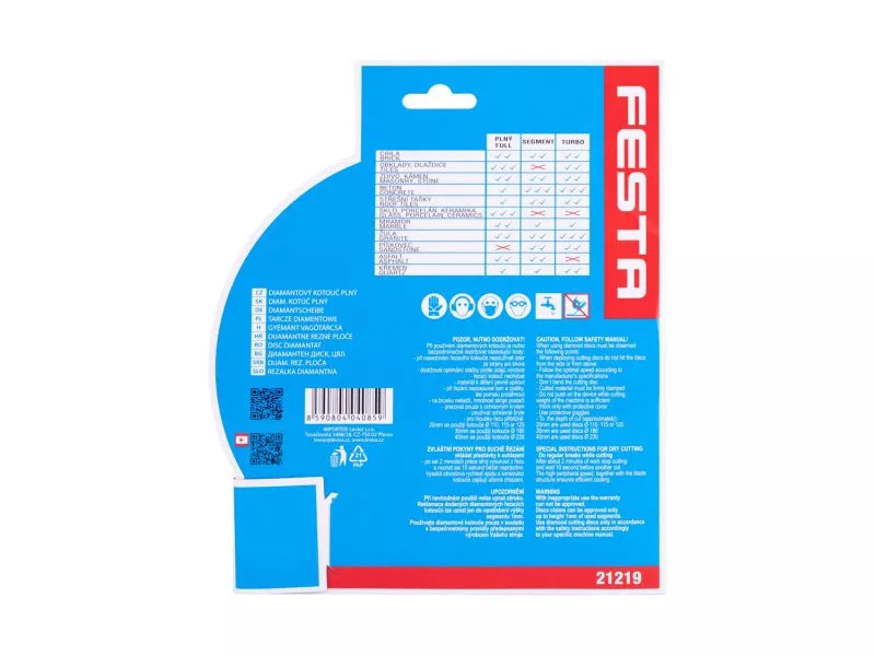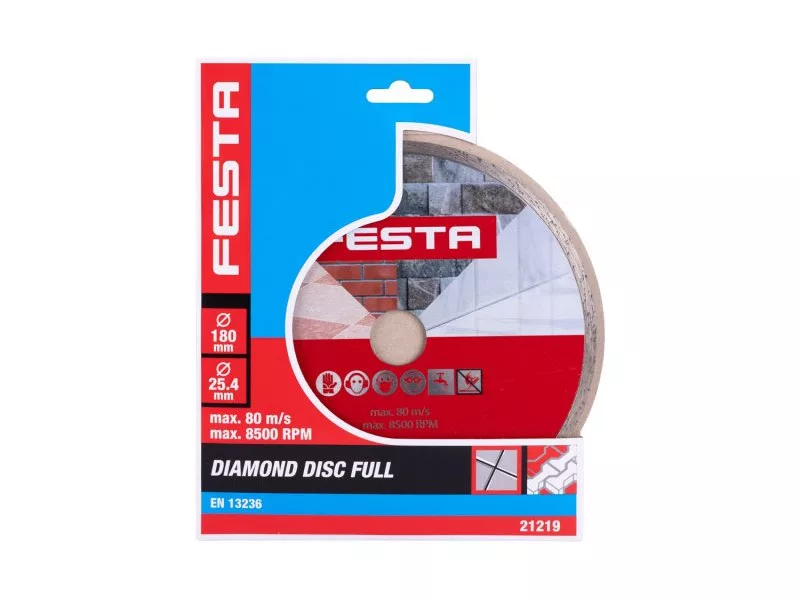 FESTA professzionális gyémántpenge, kivitel: FULL - körbefutó, kiváló minőségű gyémántréteg magas gyémántpor tartalommal, precíz megmunkálás - magas hőmérsékletnek ellenálló tárcsatartó koronghoz való csatlakozás, felhasználás: burkolat nedves és száraz vágására szolgál és csempézés, beton, tégla, falazat, gránit, márvány, kő, üveg, kerámia, csomagolás: eurólyukkal ellátott buborékfólia, méretek: a termék megnevezésében szerepel.