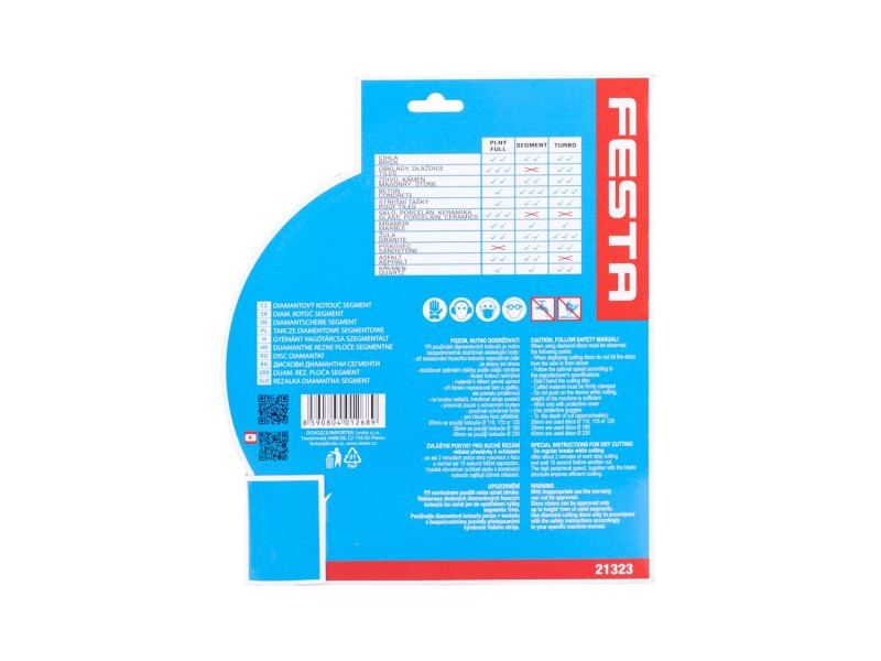 FESTA professzionális gyémántpenge, kialakítás: SZEGMENTES, kiváló minőségű anyagok és megmunkálás - a gyémánt szegmensek nagy szilárdságú rögzítése a penge tartótárcsájához, magas gyémántpor tartalom a szegmensekben, felhasználás: beton, tégla száraz vágásához , falazat, kő, ..., csomagolás: eurólyukkal ellátott buborékfólia, méretek: a termék megnevezésében szerepel.