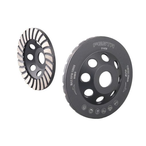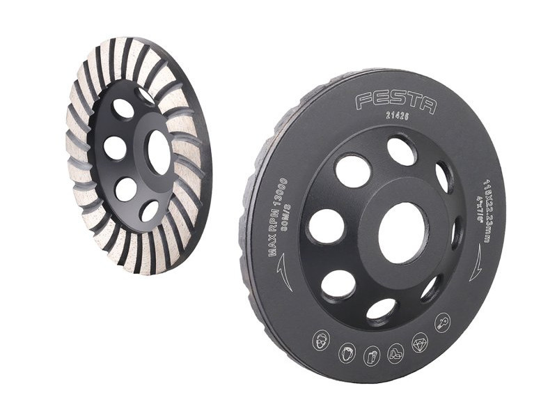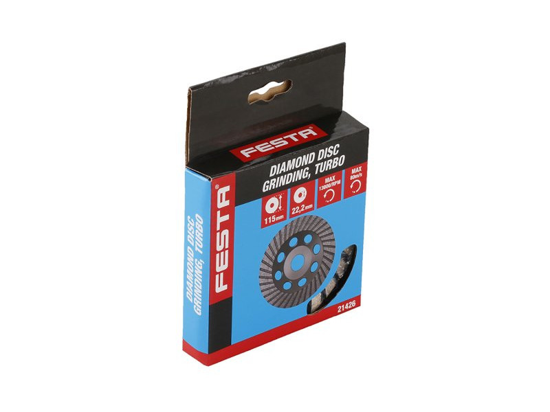 Schleifscheibe FESTA Turbo Diamant, robuste Trägerplatte aus fester Legierung, spezielle Befestigung von Diamantsegmenten an der Trägerscheibe der Scheibe, hoher Diamantstaubgehalt in den Segmenten, Anwendung: Trockenschliff für Marmor, Granit, Backstein, Mauerwerk, Natur- und Kunststein, Fliesen, Fliesen..., lamelliertes Design geeignet für feines Schleifen, Abmessungen: wie in der Produktbezeichnung angegeben, Verpackung: Pappkarton mit Euroloch.