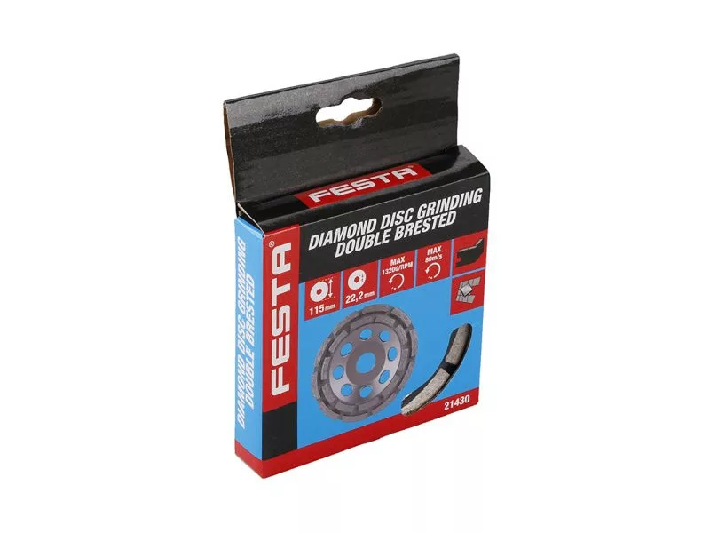 FESTA gyémánt csiszolókorong - kétsoros, robusztus tartólemez tömör ötvözetből készült, speciális kialakítású gyémántszegmensek rögzítése a korong tartótárcsájához, magas gyémántpor tartalom a szegmensekben, felhasználás: száraz és nedves köszörüléshez márvány, gránit, tégla, falazat, természetes és műkő, csempe, burkolat, beton..., a szegmensek formája és kialakítása durva és gyors csiszolásra alkalmas, méretek: a termék megnevezésében feltüntetve, csomagolás: papírdobozban euró lyuk.