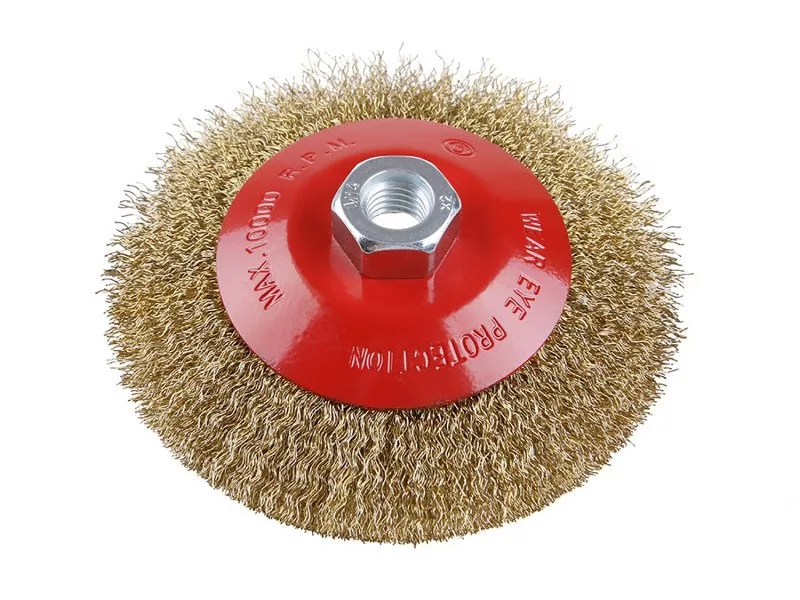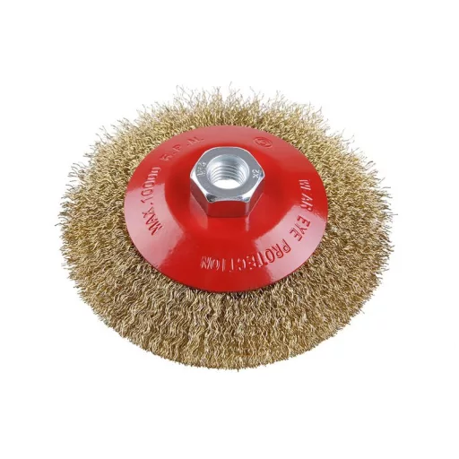 Forgókefe - csésze, FESTA kefe minőségi felhasznált anyagokat és feldolgozást garantál, hullámos huzal - sárgaréz bevonatú 0,3 mm, átmérő 125 mm, M14 rögzítés, huzalok száma 1800, maximális fordulatszám percenként. 12500, felhasználás: rozsda eltávolítására, festékre, polírozásra.