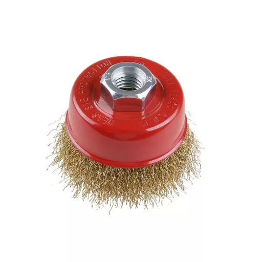 Forgókefe - csésze, FESTA kefék garantálják a felhasznált anyagok és feldolgozás minőségét, hullámos huzal - sárgaréz bevonat 0,3 mm, átmérő 65 mm, rögzítés M14*2, huzalok száma 1350, huzalhossz 23 mm, maximális fordulatszám percenként. 12500, használja: rozsda eltávolítására, festékre, polírozásra