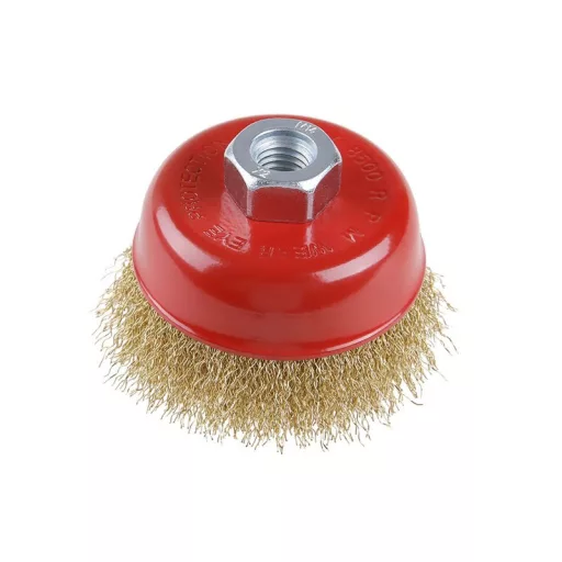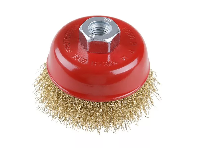 Forgókefe - csésze, FESTA kefék garantálják a kiváló minőségű felhasznált anyagokat és feldolgozást, hullámos huzal - sárgaréz bevonatú 0,3 mm, átmérő 85 mm, rögzítés M14*2, huzalok száma 1350, huzalhossz 23 mm, maximális fordulatszám percenként. 12500, felhasználás: rozsda eltávolítására, festékre, polírozásra.