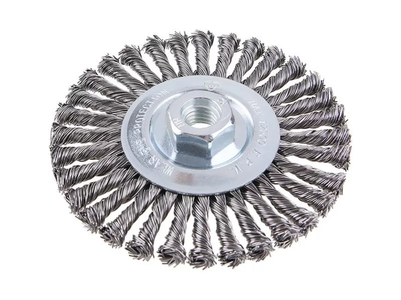 Forgókefe - radiális, kivitel: COPY - szabadalmaztatott huzal 0,5 mm - másolás, extrém terhelés mellett sem bomlik ki, a FESTA kefék garantálják a minőségi felhasznált anyagokat és megmunkálást, átmérő 100 mm Menet M14x2mm Horganyzott kefetest Huzalok száma: 1584, Huzal hossza: 27mm max. megengedett sebesség: 10000 1/min Alkalmazás: festék, rozsda, sorja, hegesztési maradványok, salak eltávolítása, érdesítés, fém tisztítása
