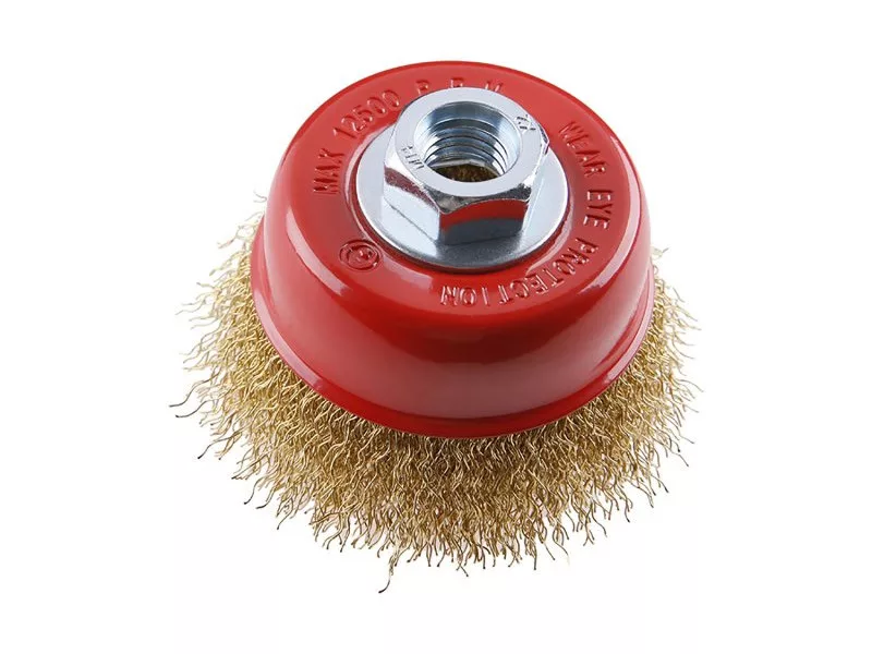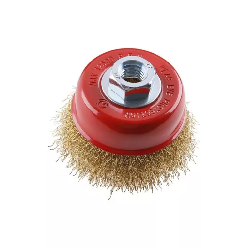 Rotationsbürste - Schüssel, FESTA Bürsten garantieren hochwertige Materialien und Verarbeitung, gewellter Draht - Messingbeschichtung 0,3 mm, Durchmesser 75 mm, Befestigung M14*2, Anzahl der Drähte 1350, Drahtlänge 23 mm, maximale Drehzahl pro Minute. 12500, Anwendung: zum Entfernen von Rost, Farbe, Polieren..., Verpackung in Papierschachtel mit Euroloch.
