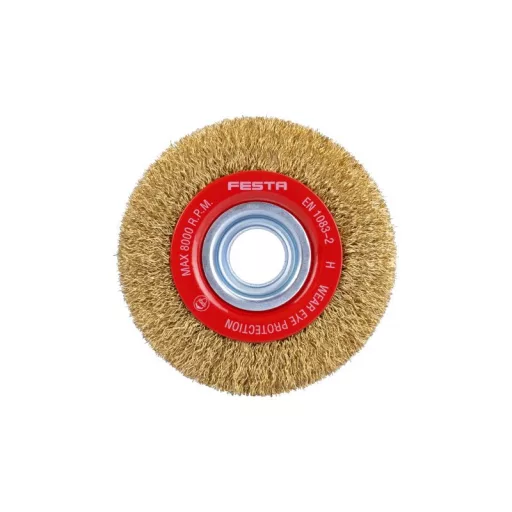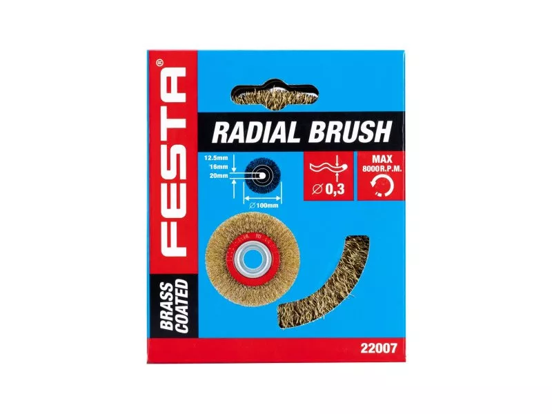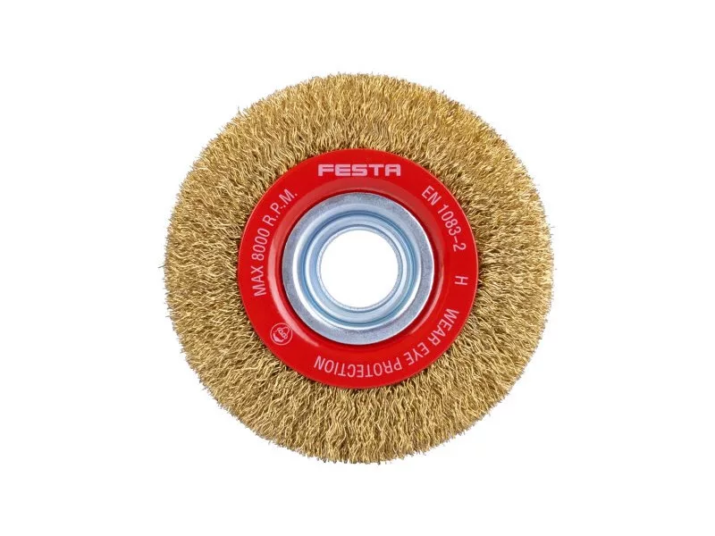 Forgókefe - kör alakú, kivitel: hullámos huzal, FESTA kefék garantálják a felhasznált anyagok és megmunkálás minőségét, huzal 0,3 mm - sárgaréz, átmérő 100 mm, rögzítési furat 20 mm (12,5 és 16 mm-es szűkítő gyűrűkkel együtt), huzalok száma 3000, huzal hossza 22 mm, maximális fordulat/perc. 8000, lakatos, fémmegmunkálási munkákra alkalmas, rozsdamentesítés, festék, polírozás..., csomagolás: papírdoboz.