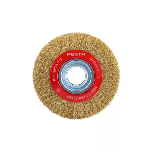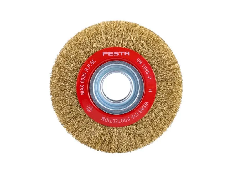 Forgókefe - kör alakú, kialakítás: hullámos huzal, FESTA kefék garantálják a minőségi felhasznált anyagokat és feldolgozást, huzal 0,3 mm - sárgaréz, átmérő 150 mm, rögzítési furat 32 mm (beleértve a szűkítő gyűrűket 12,7 mm - 1/2, 15,8 mm - 5 /8, 19 mm - 3/4, 22,2 mm és 25,4 mm - 1), vezetékek száma 7200, huzalhossz 30 mm, maximális fordulatszám percenként. 6000, lakatos és fémmegmunkálási munkákra alkalmas, rozsda eltávolítás, festék, polírozás..., csomagolás: papírdoboz.