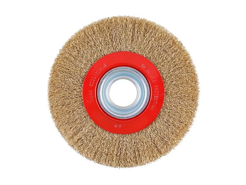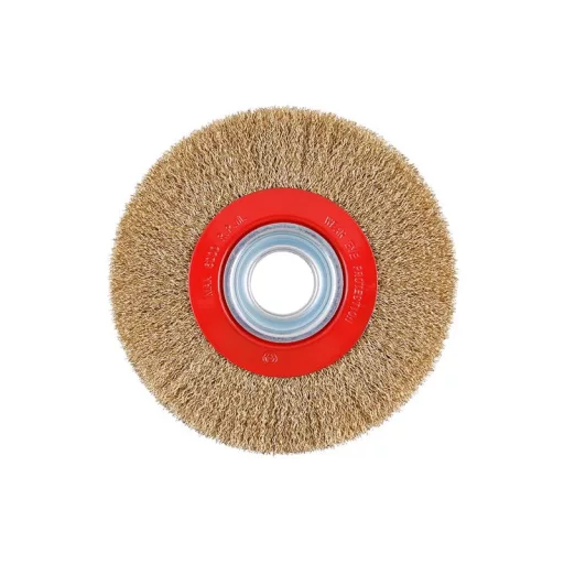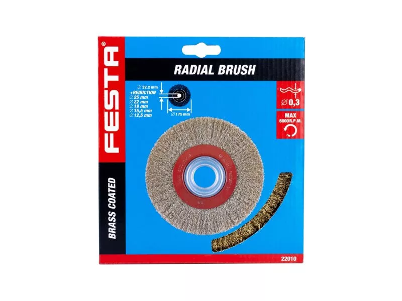 Forgókefe - kör alakú, kialakítás: hullámos huzal, FESTA kefék garantálják a minőségi felhasznált anyagokat és megmunkálást, huzal 0,3 mm - sárgaréz, átmérő 175 mm, rögzítési furat 32 mm (beleértve a szűkítő gyűrűket 12,7 mm - 1/2, 15,8 mm - 5 /8, 19 mm - 3/4, 22,2 mm és 25,4 mm - 1), vezetékek száma 7200, huzalhossz 41 mm, maximális fordulatszám percenként. 6000, lakatos és fémmegmunkálási munkákra alkalmas, rozsda eltávolítás, festék, polírozás..., csomagolás: papírdoboz.
