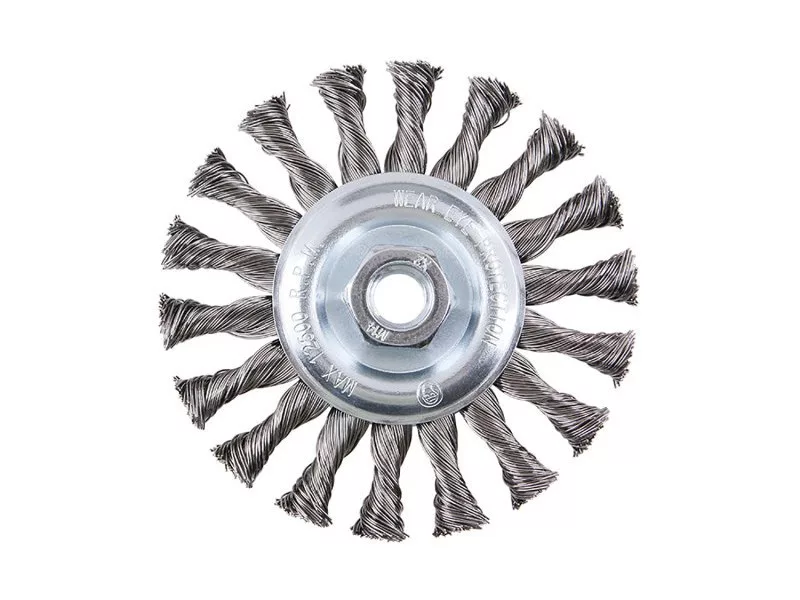 Forgókefe - radiális, változat: COPY - szabadalmaztatott huzal 0,5 mm - másolás, extrém terhelés esetén sem bomlik ki, FESTA kefék garantálják a kiváló minőségű felhasznált anyagokat és megmunkálást, átmérő 115 mm, menet M14x2mm, horganyzott kefetest, vezetékek száma: 900, huzalhossz: 27 mm, megengedett fordulatszám: 12500 1/min, felhasználás: festék, rozsda, sorja, hegesztési maradványok, salak eltávolítása, érdesítés, fém alkatrészek tisztítása, csomagolás: papírdoboz eurolyukkal.