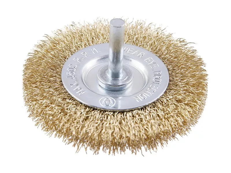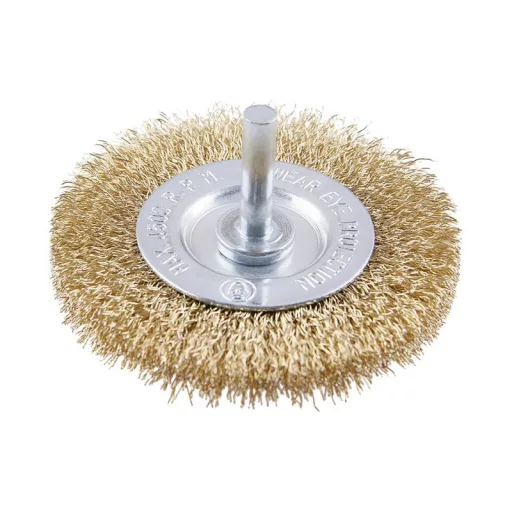 Forgókefe - kör alakú, kivitel: hullámos huzal 0,25 mm - sárgaréz, átmérő 75 mm, szár 6 x 27 mm, horganyzott kefetest, huzalok száma: 1728, huzalhossz: 16 mm, megengedett fordulatszám: 4500 1/. min, felhasználás: polírozáshoz, érdesítéshez, rozsda és sorja eltávolításához, csomagolás: eurolyukkal ellátott buborékfólia.