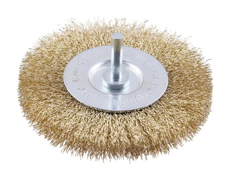 Forgókefe - kör alakú, kivitel: hullámos huzal 0,25 mm - sárgaréz, átmérő 100 mm, szár 6 x 27 mm, horganyzott kefetest, huzalok száma: 1800, huzalhossz: 23 mm, megengedett fordulatszám: 4500 1/. min Felhasználás: polírozáshoz, érdesítéshez, rozsda és sorja eltávolításához.