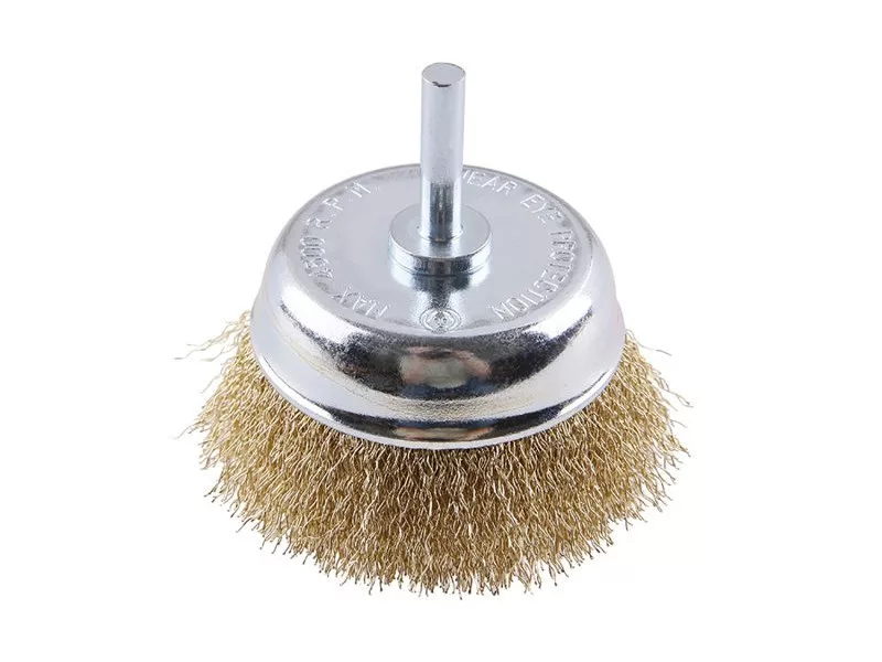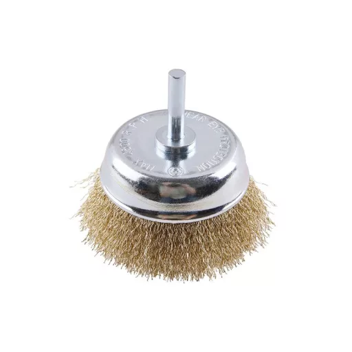 Forgókefe - csésze, kivitel: hullámos huzal 0,25 mm - sárgaréz, átmérő 68 mm, szár 6 x 27 mm, horganyzott kefetest, huzalok száma: 1728, huzalhossz: 19 mm, megengedett fordulatszám: 4500 1/. min , felhasználás: polírozáshoz, érdesítéshez, rozsda és sorja eltávolításához