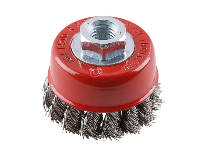 Forgókefe - csésze, kivitel: COPY - szabadalmaztatott rozsdamentes acélhuzal 0,5 mm - másolás, extrém terhelés mellett sem bomlik ki, FESTA kefék garantálják a minőségi felhasznált anyagokat és megmunkálást, átmérő 75mm, menet M14x2mm, huzalok száma: 720, huzal hossza: 18,5 mm, megengedett sebesség: 12500 1/min, felhasználás: festék, rozsda, sorja, hegesztési maradványok, salak eltávolítása, érdesítés, fém alkatrészek tisztítása, csomagolás: papírdoboz eurolyukkal.
