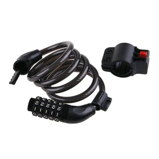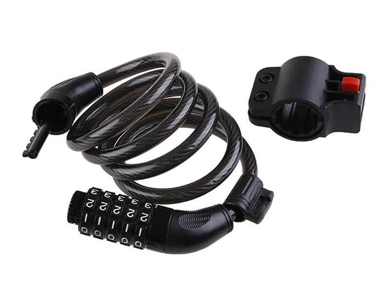 Einfach zu transportieren. Mit einer 5-stelligen Kombination abschließbar. Kann dank des Halters am Fahrradsattelrohr leicht am Fahrrad befestigt werden. Material: flexibles Stahlseil mit Vinylbeschichtung.