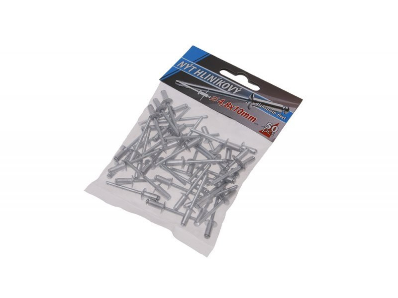Klasszikus redőny-alumínium szegecsek, átmérő 4,8 mm, hossza 10 mm, 50 db-os kis kiszerelésben, kisfogyasztóknak megfelelő.