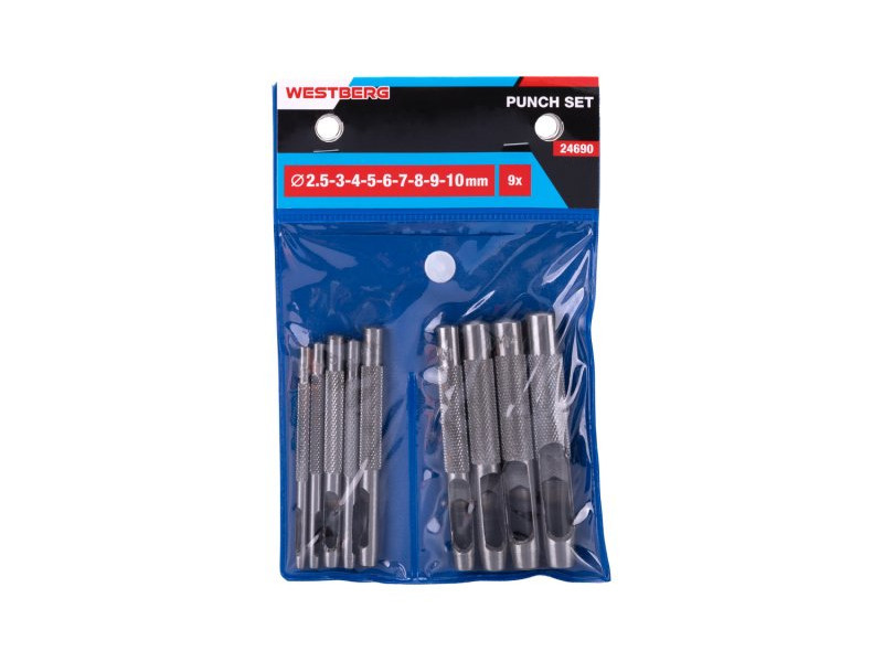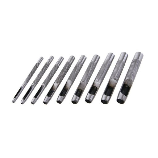 Acél bőr ütések. A lyukasztók oldalsó hulladékleeresztővel vannak felszerelve. 9 db-os készlet. Lyukasztó átmérők: 2,5 mm, 3 mm, 4 mm, 5 mm, 6 mm, 7 mm, 8 mm, 9 mm, 10 mm.