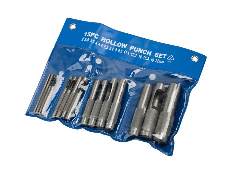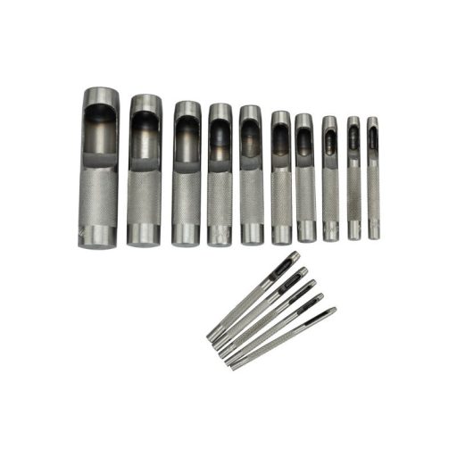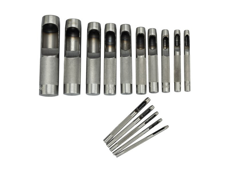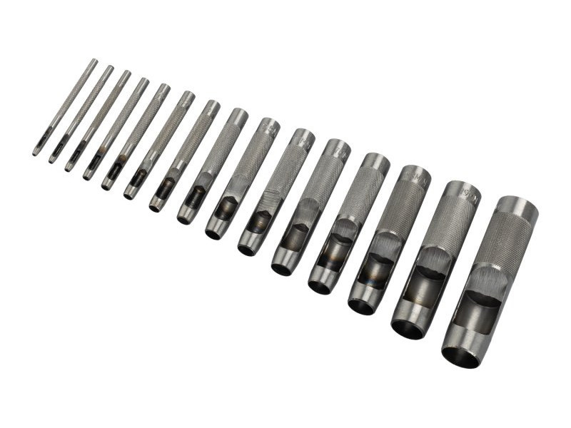 Acél bőr ütések. A lyukasztók oldalsó hulladékleeresztővel vannak felszerelve. 15 db-os készlet. Lyukasztó átmérők: 2 mm, 2,5 mm, 3,2 mm, 4 mm, 4,8 mm, 5 mm, 6,4 mm, 8 mm, 9,5 mm, 11,1 mm, 12,7 mm, 14 mm, 15,8 mm, 19 mm, 22 mm.