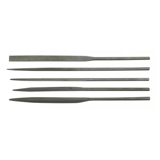 The set includes five files for precise works, e.g. making keys. The basic profiles are flat, semi -circular, round, triangular, and knife. Filots with tips without plastic frames. For precise metal processing, some plastics and other materials