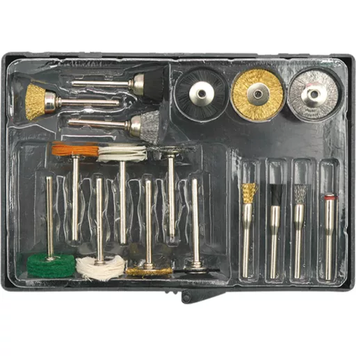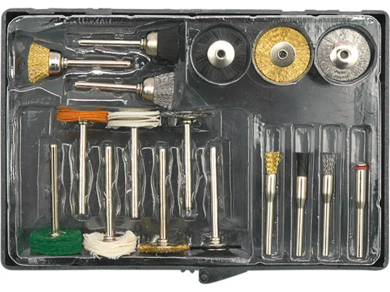 A set of 17 accessories complementing the basic equipment of a straight grinder. It enables quick, easy and economical work accessories allow for precise processing of small elements. They match the 3.2mm tool opening grinders. Accessories are used for grinding and polishing. Accessories designed for precise grinding and modeling works in metal, wood, plastics and other materials. Wire brushes nylon brushes wire mandrels for inserting shields with brushes.