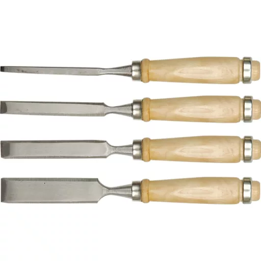 A set of four chisels for wood. Sands traditionally made of wood, reinforced with metal fittings. Steel blade with widths 6/12/18 and 24 mm