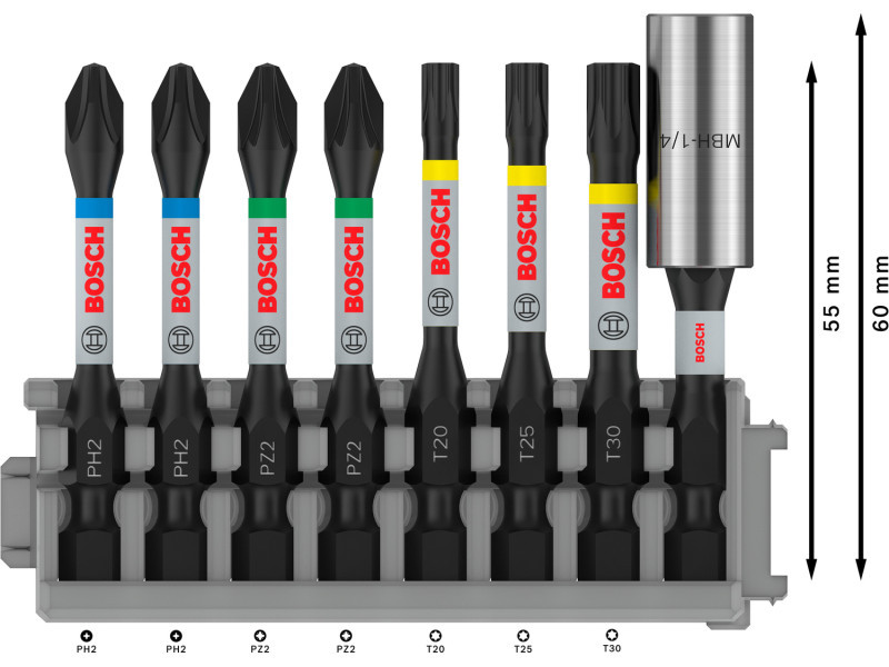 Setinhalt: Universelle magnetische Halterung, PH2 (2 Stück), PZ2 (2 Stück), T20, T25, T30