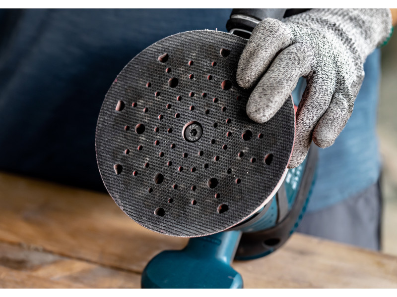 Die scheinbar zufällige Anordnung der Löcher ist tatsächlich das Ergebnis sorgfältiger Forschung: sie passen zu allen Schleifplattenanordnungen, dies gewährleistet die längste und effizienteste Lebensdauer.