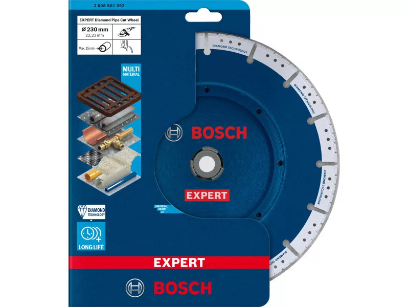 Az EXPERT Pipe Cut Wheel a Bosch Diamond Technology megoldását alkalmazza, ami acéltesthez rögzített, optimális minőségű gyémántszemcséket jelent.
