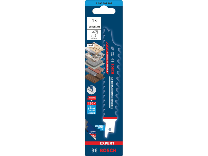 Az EXPERT Multi Material Demolition szablyafűrészlap ultra kemény, megerősített keményfém fogakkal rendelkezik, amelyeket szilárdságra, tartósságra és nagy sebességű vágásra terveztek. Innovatív, karom alakú első foga segít gyorsan beleharapni az anyagba. A fűrészlap tetején található agresszív 3-TPI keményfém fogaknak köszönhetően könnyedén vághatsz visszafelé is, anélkül, hogy meg kellene fordítanod a szerszámgépet. A nagy hornyok hatékonyan eltávolítják a forgácsokat, így a legkeményebb anyagokat is gyorsabban lehet vágni, mint valaha.