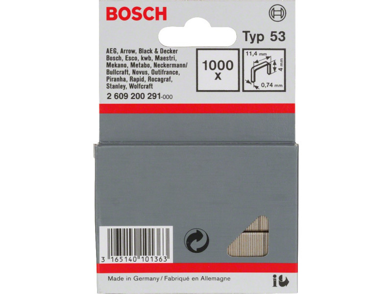 Die schmalen Flachdrahtklammern können mit den Heftgeräten der folgenden Marken verwendet werden: AEG, Arrow, Black+Decker, Bosch, Esco, kwb, Maestri, Mekano, Metabo, Neckermann/Bullcraft, Novus, Outifrance, Piranha, Rocagraf, Stanley, Skil, Wolfcraft