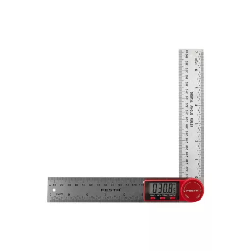 Digitális szögmérő belső és külső szögek mérésére. Reteszelő csavarral felszerelve egy bizonyos szög megtartásához. Mérési tartomány ± 360 °. Pontosság ± 0,3 °. Üzemi hőmérséklet 0-50°C. Automatikus kikapcsolás. Nulla beállítás bármilyen helyzetben. 1 mm-es és 1/32 hüvelykes vonalzós mérlegek. Vonalzó keresztmetszete 35 x 2,5 mm. Két rögzítési lyuk. Rögzítő csavarok. Tápellátás 1 db CR2032 3V típusú elem.