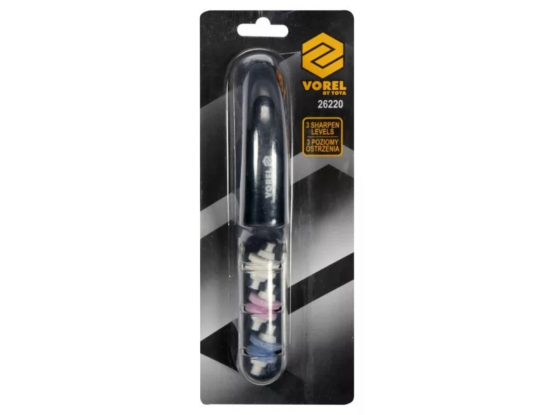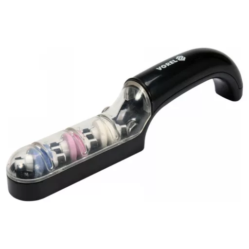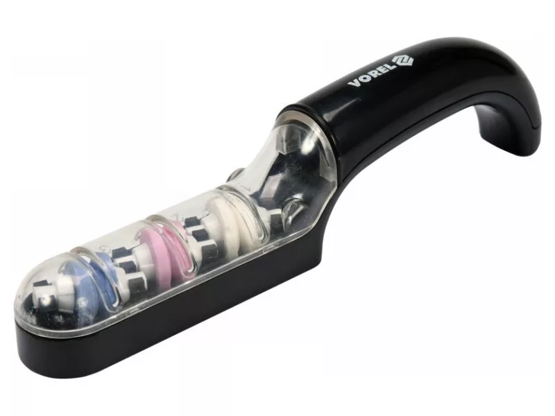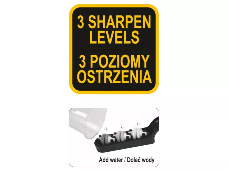 Sharpener with three double discs of different hardnesses designed for effective sharpening of knives and other similar tools. The body, made of damage-resistant plastic, also acts as a water reservoir. abrasive discs work "wet" increasing the efficiency of sharpening.