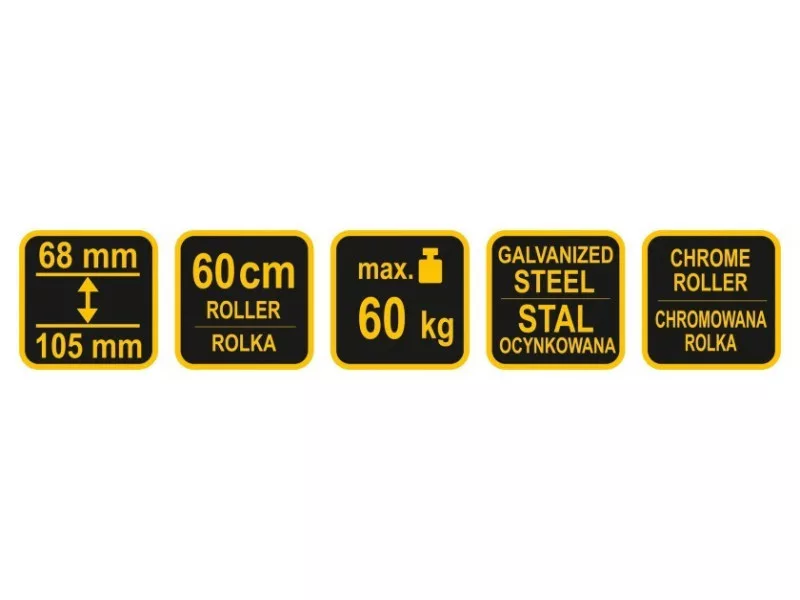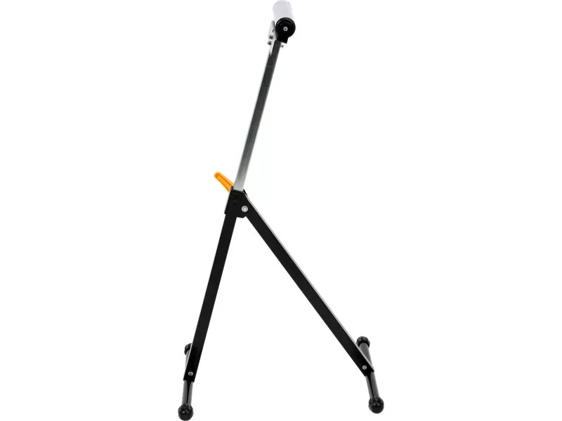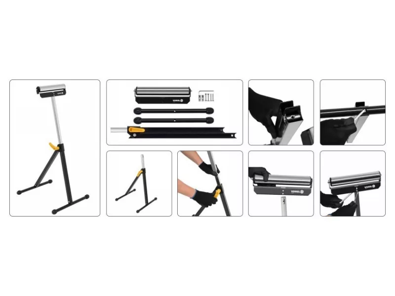 Metal support with transport roller / shaft / for supporting long workpieces during machining / e.g. at the saw or router table /. Load capacity approx. 60 kg. Support height adjustable from 68 to 105 cm, roller width 29 cm. Legs made of galvanised and lacquered sheet steel , profile 30 x 30 mm . For supporting long workpieces during machining operations, e.g. sawing or milling.