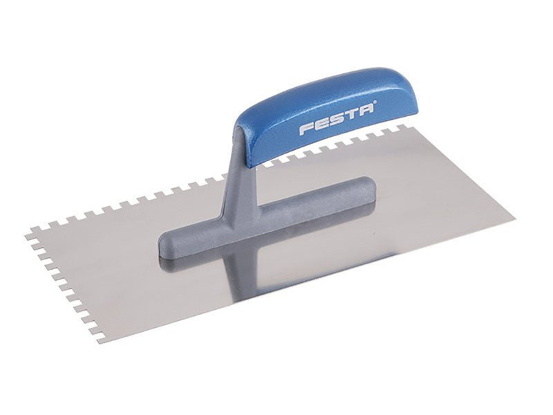 Rozsdamentes fogazott simító FESTA 280x130 mm, e6 fog, fa lakkozott nyéllel, lapvastagság 0,8 mm. Elsősorban csempék és burkolatok alá ragasztók felhordására, valamint esztrichek, stukkó, vakolatok, tömítőanyagok és egyéb építőanyagok felhordására használják. A rozsdamentes fogazott simító lehetővé teszi a ragasztó vagy építőanyag nyújtását csíkokban és a simító fogának megfelelő magasságban.