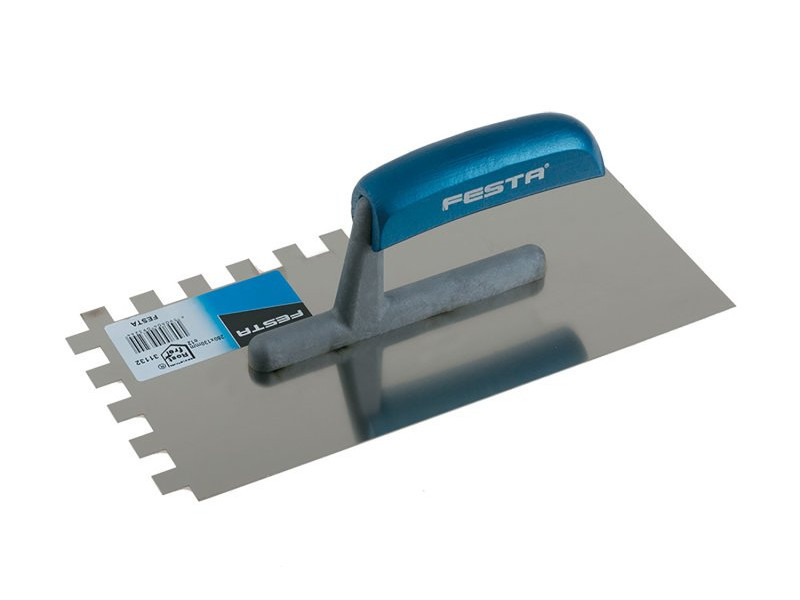 Rozsdamentes fogazott simító FESTA 280x130 mm, e12 fog, fa nyéllel, lemezvastagság 0,8 mm. Elsősorban csempék és burkolatok alá ragasztók felhordására, valamint esztrichek, stukkó, vakolatok, tömítőanyagok és egyéb építőanyagok felhordására használják. A rozsdamentes fogazott simító lehetővé teszi a ragasztó vagy építőanyag nyújtását csíkokban és a simító fogának megfelelő magasságban.