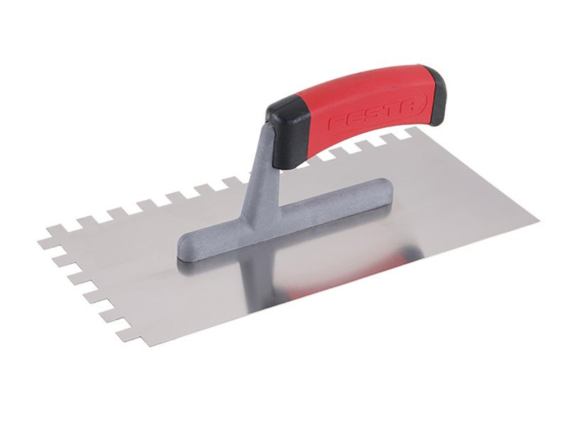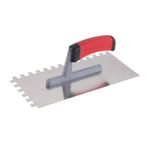 Rozsdamentes fogazott simító FESTA 280x130 mm, e10 fog, gumi nyéllel, lemezvastagság 0,8 mm. Elsősorban csempék és burkolatok alá ragasztók felhordására, valamint esztrichek, stukkó, vakolatok, tömítőanyagok és egyéb építőanyagok felhordására használják. A rozsdamentes fogazott simító lehetővé teszi a ragasztó vagy építőanyag nyújtását csíkokban és a simító fogának megfelelő magasságban.
