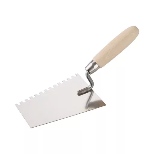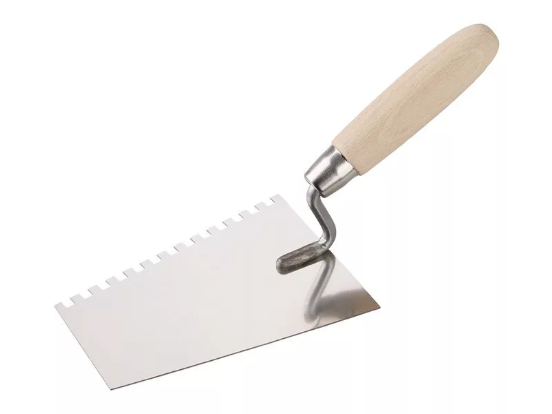 Fogazott kanál rozsdamentes acél éllel 180 mm, fa nyéllel. Ez a kőműves kanál őrölt minőségű rozsdamentes acélból készült, nyele fából készült, lakkozott és szorosan kapcsolódik a kanálhoz. A kanalat főként habarcs pórusbetonra történő lerakására használják.