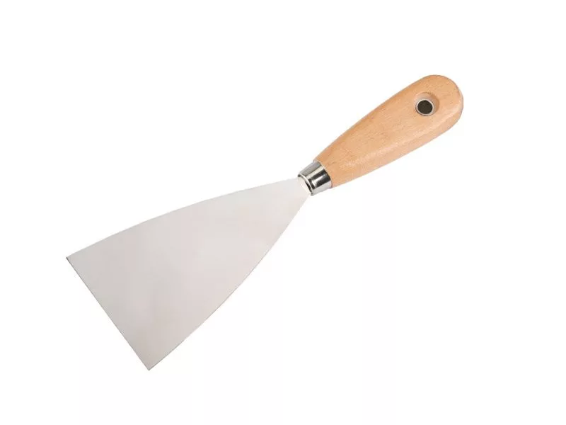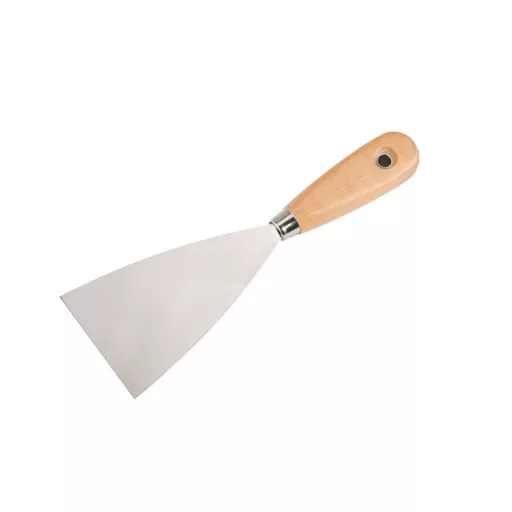 FESTA rozsdamentes acél ék spatula 80 mm fa nyéllel. Használható vakolásnál, festésnél, festésnél, karosszériajavításnál vagy művészi alkotásnál, stb. Alkalmas vakolat vagy egyéb tömítőanyag felhordására vagy régi festékek és bevonatok eltávolítására.