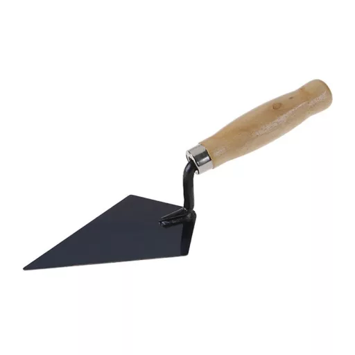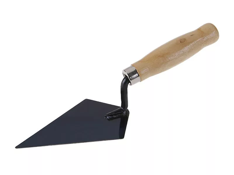 Tetőfedő kanál acél 140 x 85 mm, fa nyéllel. A kanál acélból készült, a nyél fából készült, lakkozott felülettel. Falazott acél simító tetőfedők számára.