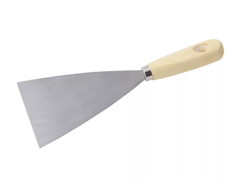 Acél spatula 100 mm, fa nyéllel. A spatula építési vakolat, tömítőanyagok felhordására és kiterítésére vagy régi tömítőanyagok, festmények vagy tapéták tisztítására és eltávolítására szolgál. A háromszög alakú formának köszönhetően az anyag nagyon könnyen felhordható és eltávolítható.