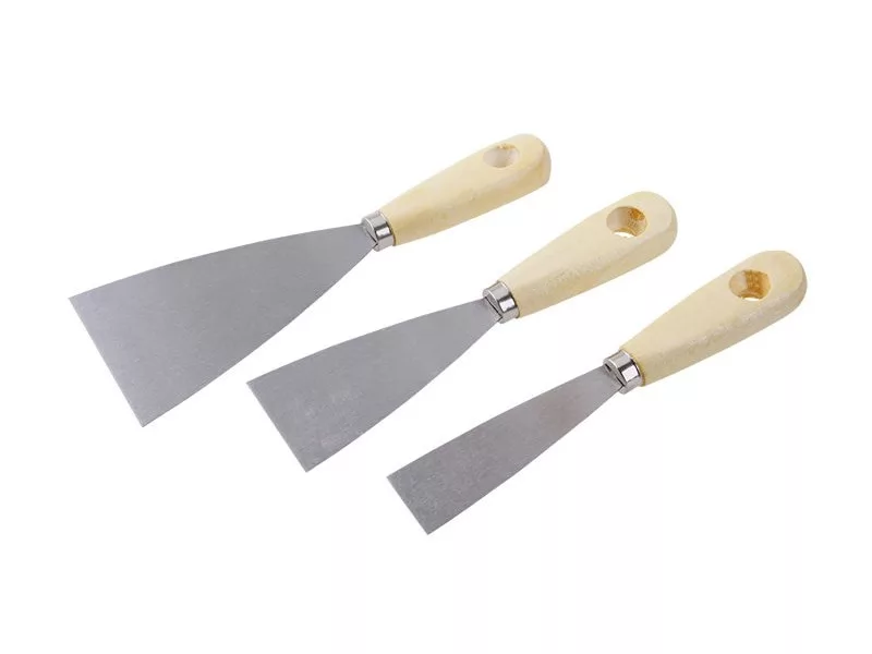 Acél spatula készlet 30, 50, 80 mm-es fa fogantyúkkal. 3 db/csomag. A spatula építési vakolat, tömítőanyagok felhordására és kiterítésére vagy régi tömítőanyagok, festmények vagy tapéták tisztítására és eltávolítására szolgál. A háromszög alakú formának köszönhetően az anyag nagyon könnyen felhordható és eltávolítható.