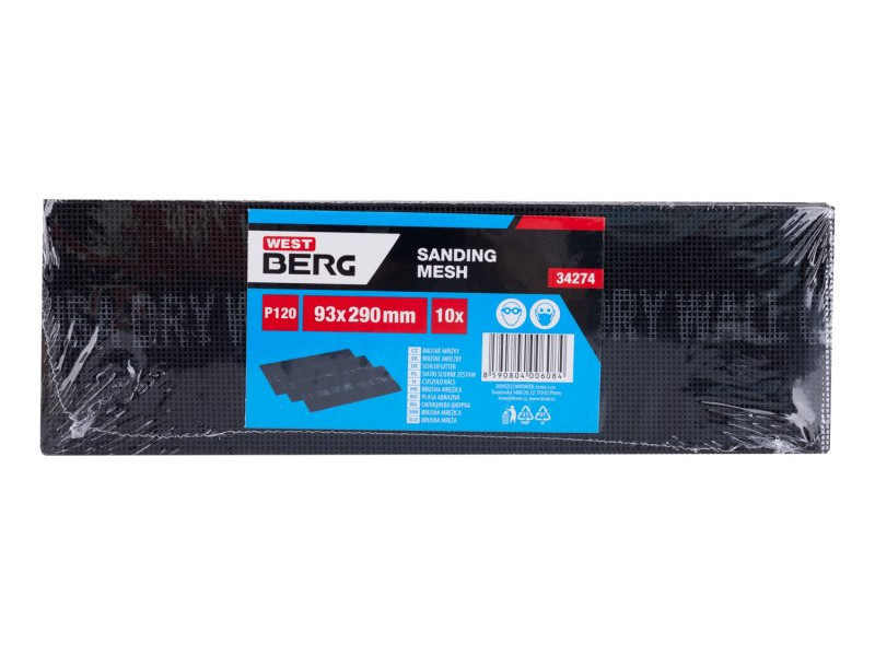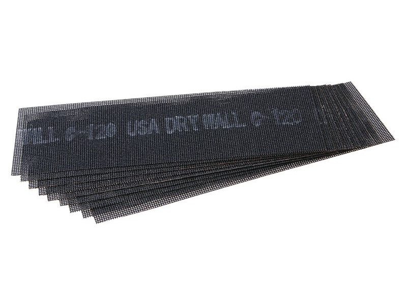 Csiszolőrács 93 x 290 mm, szemcse 120, 10 db/készlet. , üvegszálból készült tartószövet, szilícium-karbid gyantával ragasztott csiszolószemcsék antisztatikus bevonattal, alkalmas gipszkarton hézagoló keverékek és egyéb anyagok csiszolására, a rácsszerkezet előnye a hagyományos csiszolópapírokhoz képest, hogy nem tömődik el a csiszolt anyaggal .