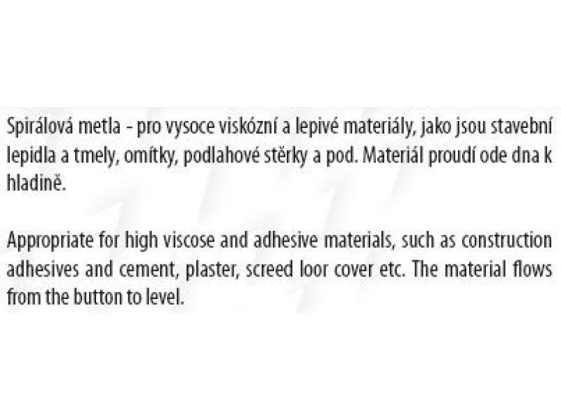 Keverő - spirális (seprű), horganyzott, méret: 90 x 500 mm, felhasználás: a spirálseprűt erősen viszkózus és ragadós anyagokhoz használják, mint például építőipari ragasztók és tömítőanyagok, vakolatok, padlóesztrichek stb., az anyag alulról folyik a felszínre.