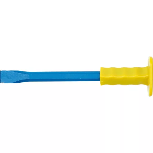 Carbon steel chisel with hardened working part. In the upper part a hard plastic handle to protect the hand from accidental impact. Blue lacquered surface.