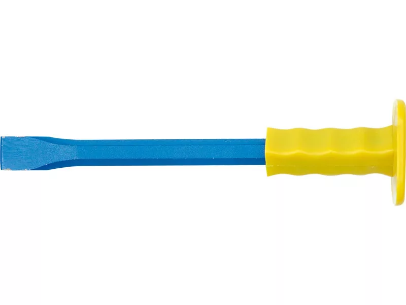 Carbon steel chisel with hardened working part. In the upper part a hard plastic handle to protect the hand from accidental impact. Blue lacquered surface. Masonry chisel for construction work