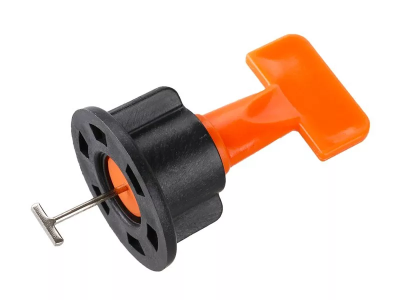 • egyszerű eljárás - szúrja be a "T" jelet a végét a csempe közötti résbe (min. 1,5 mm), majd fordítsa el 90 fokkal és húzza meg megfelelő erővel olyan anyával, amely a felület miatt egymáshoz igazítja a csempéket, lazítsa meg a mellékelt kulccsal.
