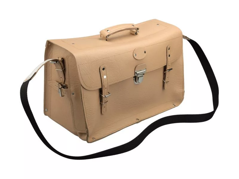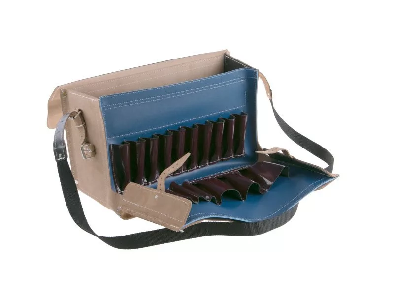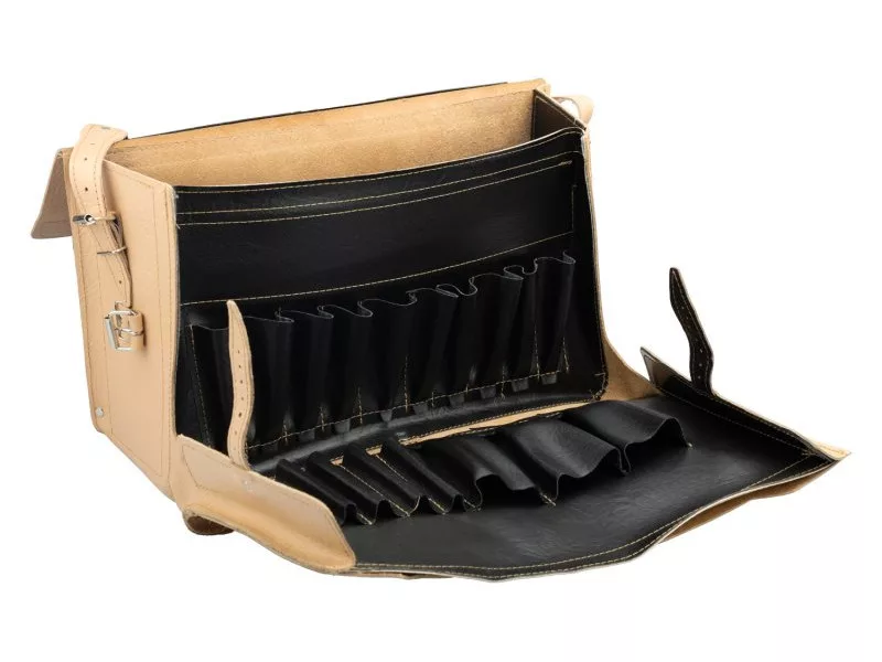 Természetes bőrből készült villanyszerelő összecsukható táska. Nyíló elején zsebekkel a szerszámok rendezett tárolására és egy nagy zsebbel a rajzok számára. Alsó, oldalsó és hátsó zseb megerősítése további szerszámok számára. Ideális lakatosoknak, beállítóknak stb. A táska speciális Amann PES cérnával van varrva, a cérna teherbírása 12 kiló, a varratok a szabad helyeken még szegecselve vannak. Jellemzők: csuklós táska eleje, fogantyú, vállpánt, acél hátsó megerősítés. Belső felépítés: 1 lapos zseb az iratok számára, válaszfal a fő tárolóban, rekeszek csavarhúzóknak és kis szerszámoknak két sorban. Erősítések: alul, hátul, táska oldalán, belső zsebben. Fő anyaga: természetes marhabőr.