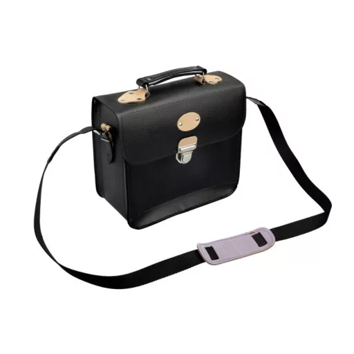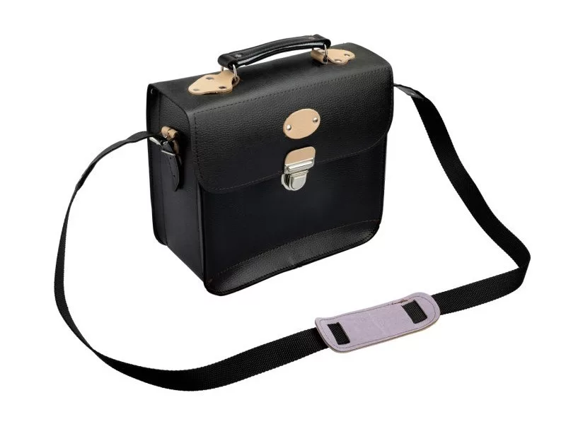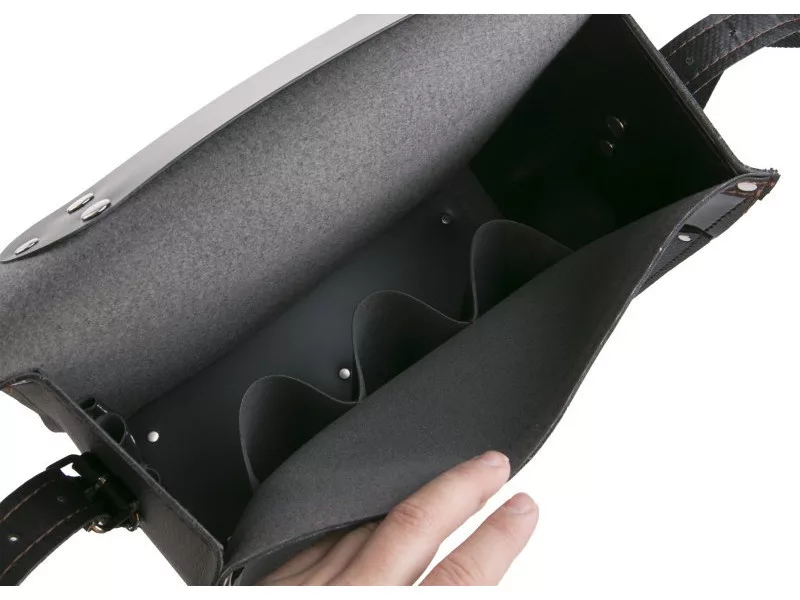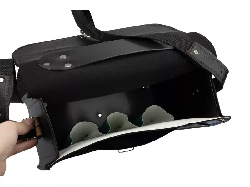Szintetikus bőrből készült kézműves táska, megerősített aljú, oldalsó és belső zsebbel. Két soros szerszámzsebbel és vállpánttal rendelkezik. Jellemzők: fogantyú, vállpánt vállpánttal, erősen megerősítve. Belső felépítés: 1 első zseb az iratoknak, 2 soros szerszámrekesz. Erősítések: alul, hátul, oldalt. Fő anyaga: természetes marhabőr védőlakkkal.