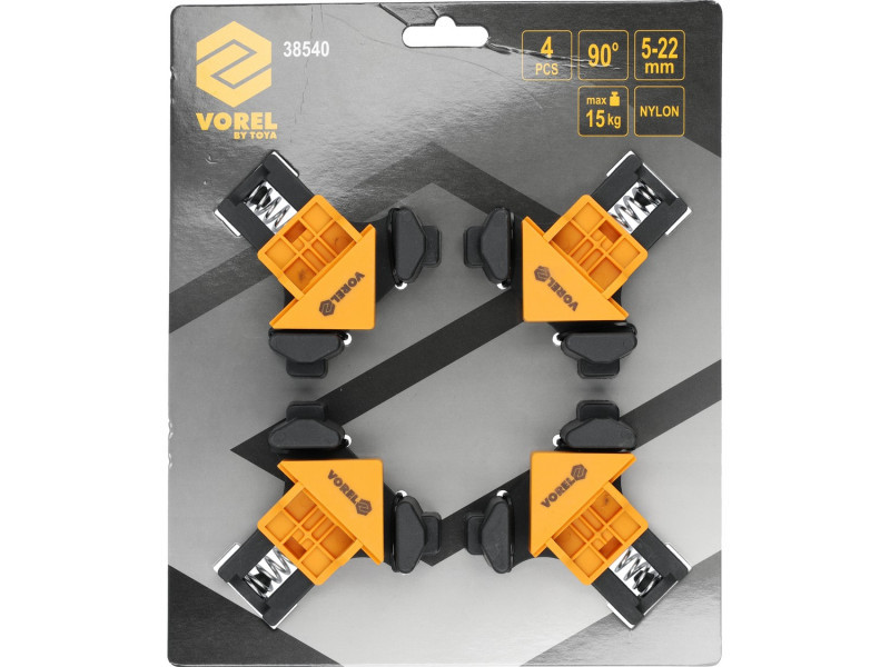 The set of spring corner clamps is a practical addition to any woodworking and assembly workshop, designed for quickly joining elements at a 90° angle. The spring-loaded design allows for efficient stabilization of components during gluing, screwing, or preliminary assembly, without the need for complex clamping systems. They are effective when working with wood, wood-based materials, and lightweight plastics, particularly for precisely aligning corners when assembling frames, boxes, furniture, and other constructions that require maintaining a right angle.