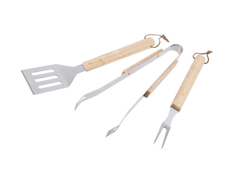 Eszközkészlet grillezéshez, rozsdamentes acél és fa, felhasználás: húsforgató spatula, esztergafogó és villa, grillezéshez és főzéshez, otthon, kertben, kempingezéskor..., ételek egyszerű és biztonságos kezelése a főzés során grill, serpenyő ..., papírdoboz csomagolás.